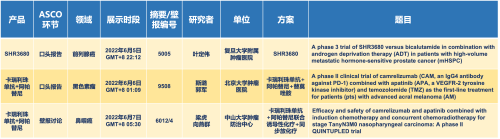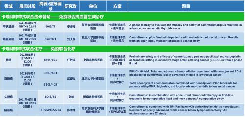 卡瑞利珠单抗联合九游会ag医药的另一款创新药法米替尼在甲状腺癌和结直肠癌领域有2项研究被接收为壁报,另有卡瑞利珠单抗联合化疗的4项研究在肺癌、结直肠癌、头颈癌和阴茎癌领域的研究被接收为5份壁报。