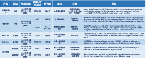 2022 ASCO年会另有5款九游会ag医药上市前抗肿瘤创新药的相关研究被接收为壁报,包括SHR-1316、普那布林、法米替尼、SHR-1701和SHR2554,他们的单药或联合方案相关7项研究被接收为壁报,覆盖肺癌、鼻咽癌、淋巴瘤、甲状腺癌和结直肠癌等领域。