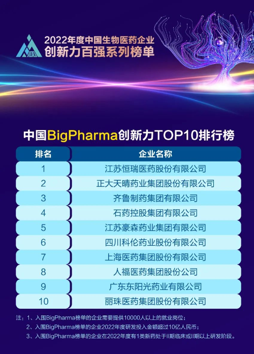 同日,2023米思会(中国医药健康产业共生大会)发布“2022年度中国生物医药企业创新力百强系列榜单”,九游会ag医药再蝉联“中国BigPharma创新力TOP10”榜首。该榜单自2021年启动评选以来,九游会ag医药稳居榜首。