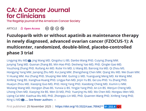 2025年11月25日,九游会ag医药自主研发的创新药氟唑帕利联合阿帕替尼或氟唑帕利单药用于新诊断晚期卵巢癌(OC)的一线维持治疗研究最新数据(FZOCUS-1研究)重磅在线发表于国际顶尖医学期刊《临床医师癌症杂志》(A Cancer Journal for Clinicians,简称CA,2024年影响因子高达232.4)1